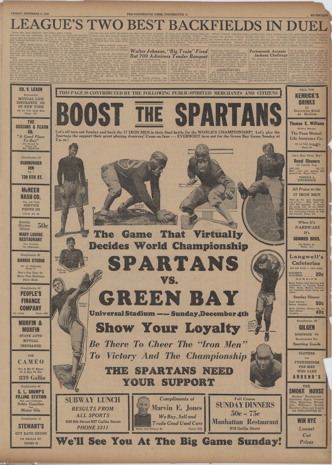 Potsy Clark, entrenador de los Espartanos, decidió no hacer cambios en todo el partido. Los Espartanos obtuvieron una inolvidable victoria blanqueando a los empacadores con solo 11 jugadores.